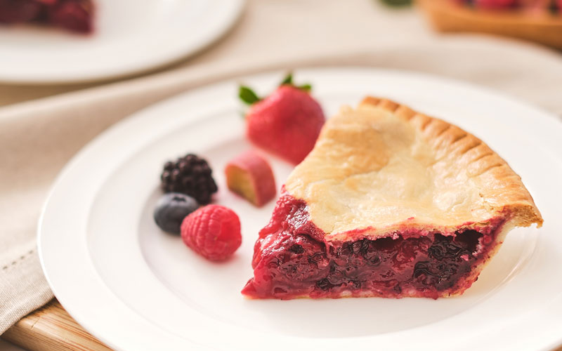 Faite à partir de fraises, mûres, framboises, bleuets et rhubarbe, notre tarte aux petits fruits offre une explosion de saveurs, tout en étant parfaitement balancée.